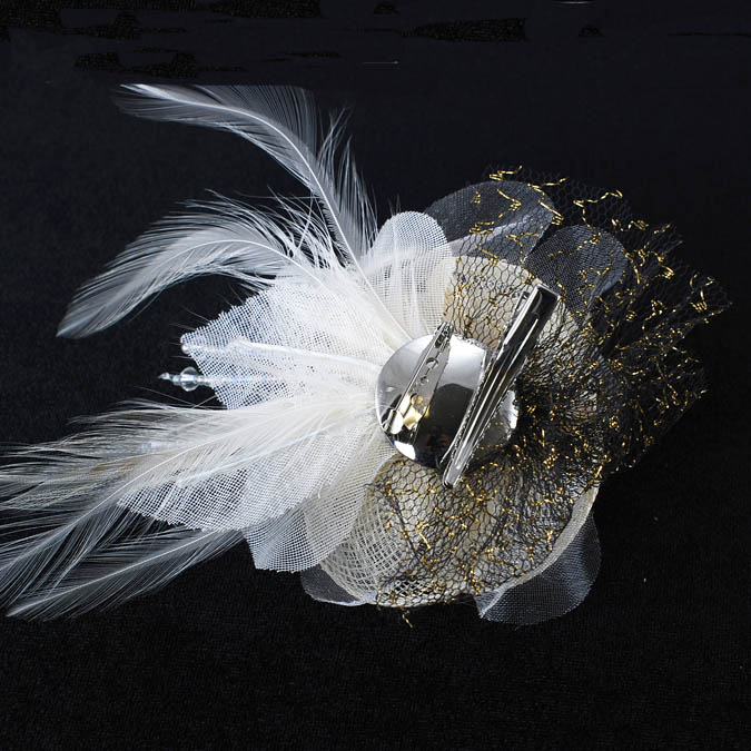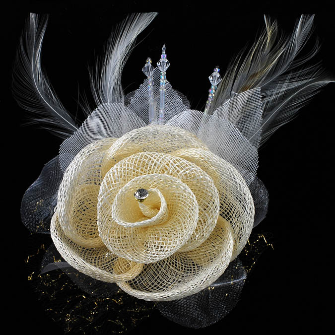 Fabric Flower brooch made in linen material with feather; Color: Cream; Size: 3 inches; height: 1-3/4 inch