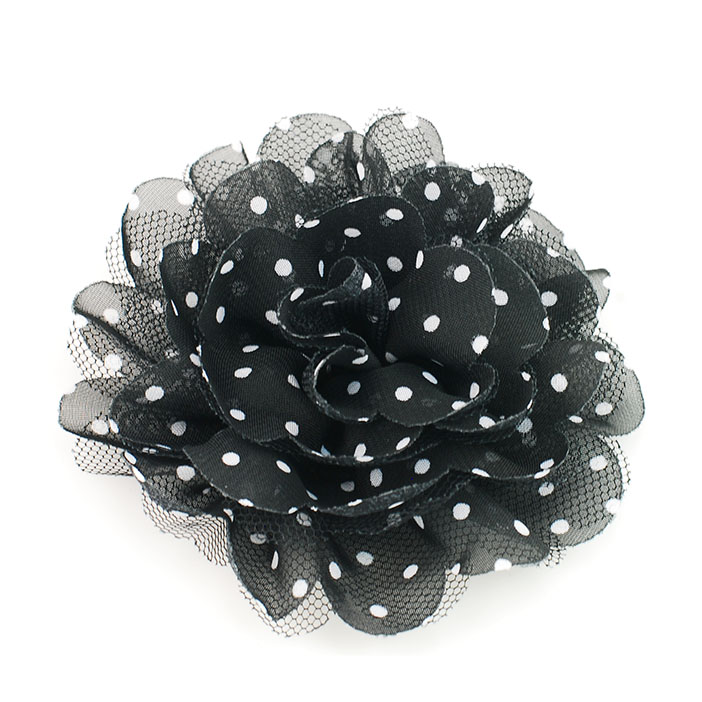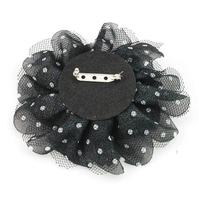 Fabric flower pin made of light black color fabric with white polka dot and soft netting. The flower pin come with safety pin on the back. Flower size is 3-3/4 inches wide and 1-1/4 inches high.