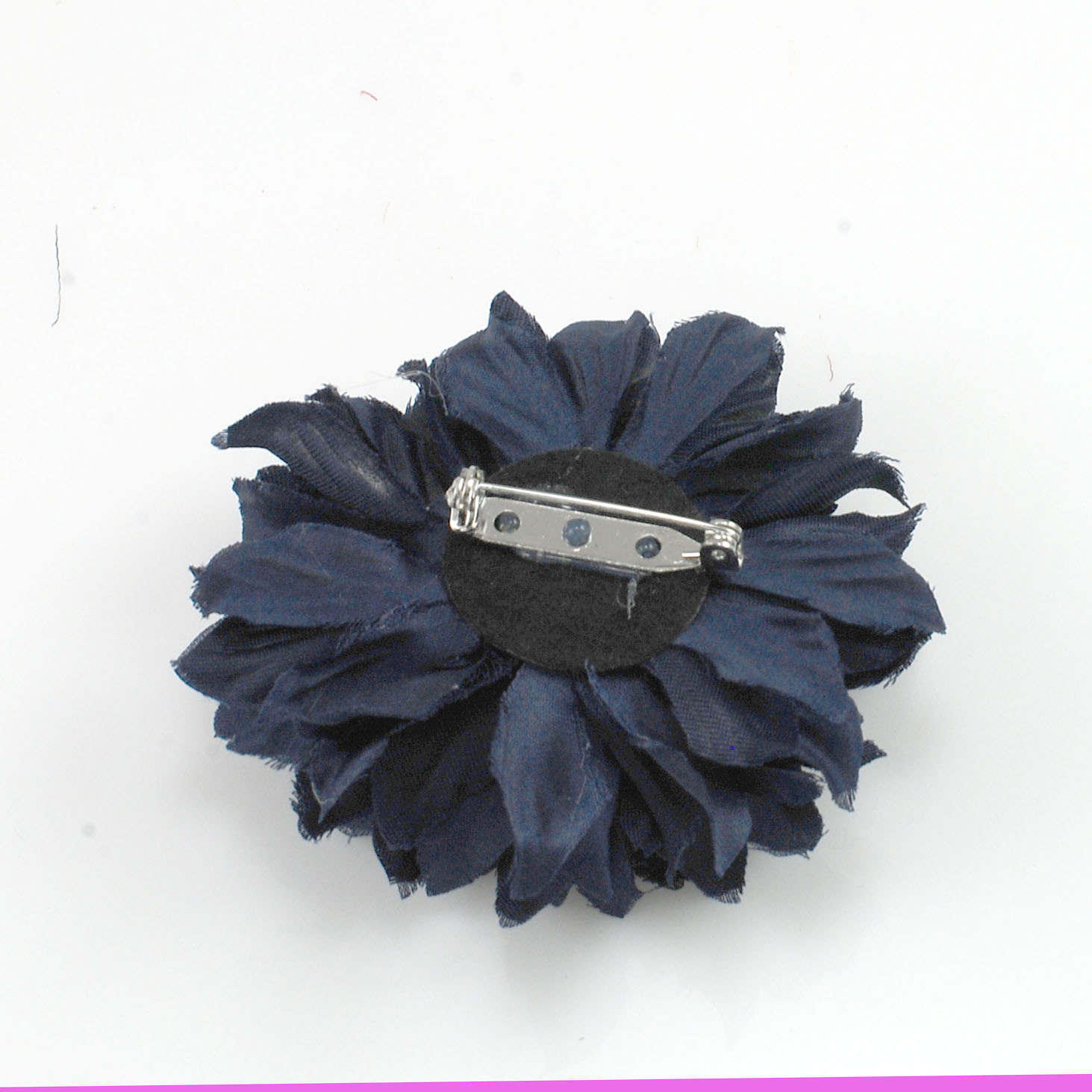 Fashion small fabric flower in dark blue color with pin on back. Size measures 2-1/2 inches across