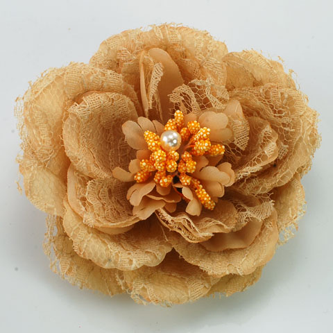 Fashion flower pin with peal in the middle, petals in lace and satin fabric with clip on the back. Colo; Beige Size in diameter: 4.5 inches