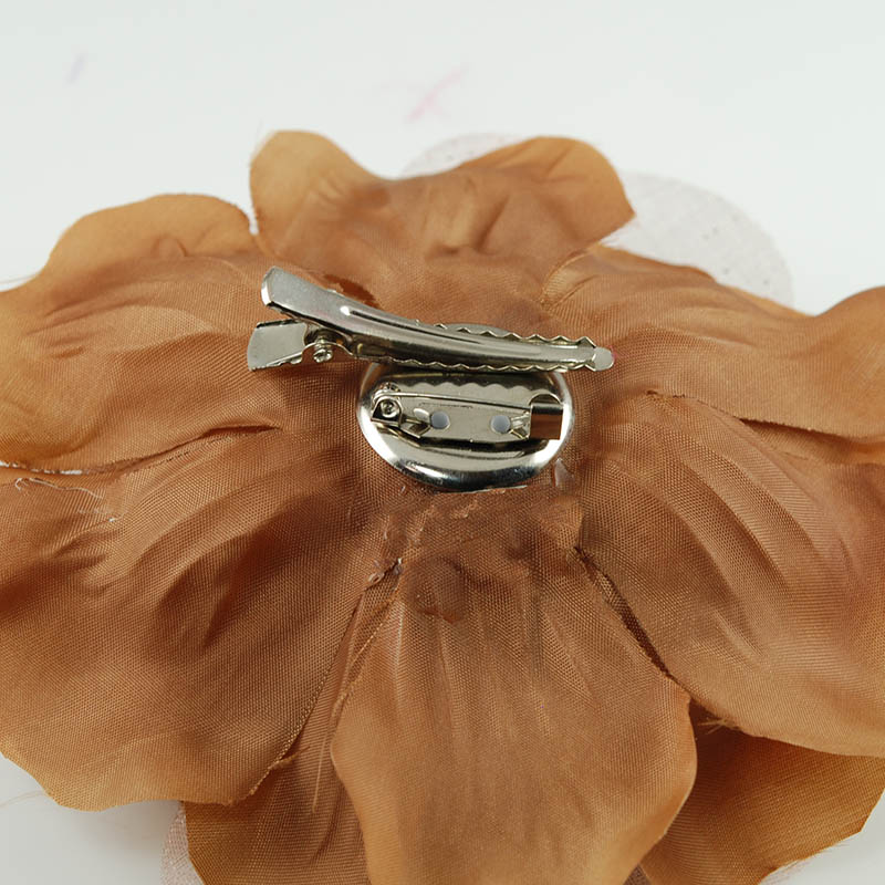 Organza rose flower pin made with combination of organza and satin fabric. The petals are in coffee color with a size 4-1/2 inches wide. On the back of the flower, there is assembled with an alligator clip and pin.