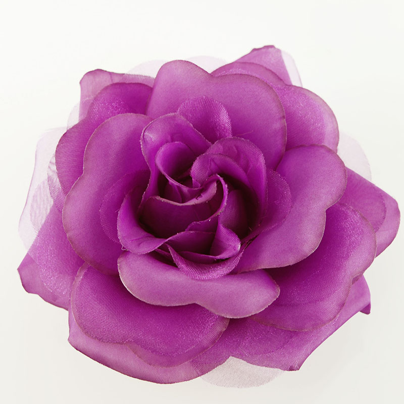 Rose style flower pin made from combination of organza and silk fabric material in purple color. Size in diameter: 4-1/2 inches wide