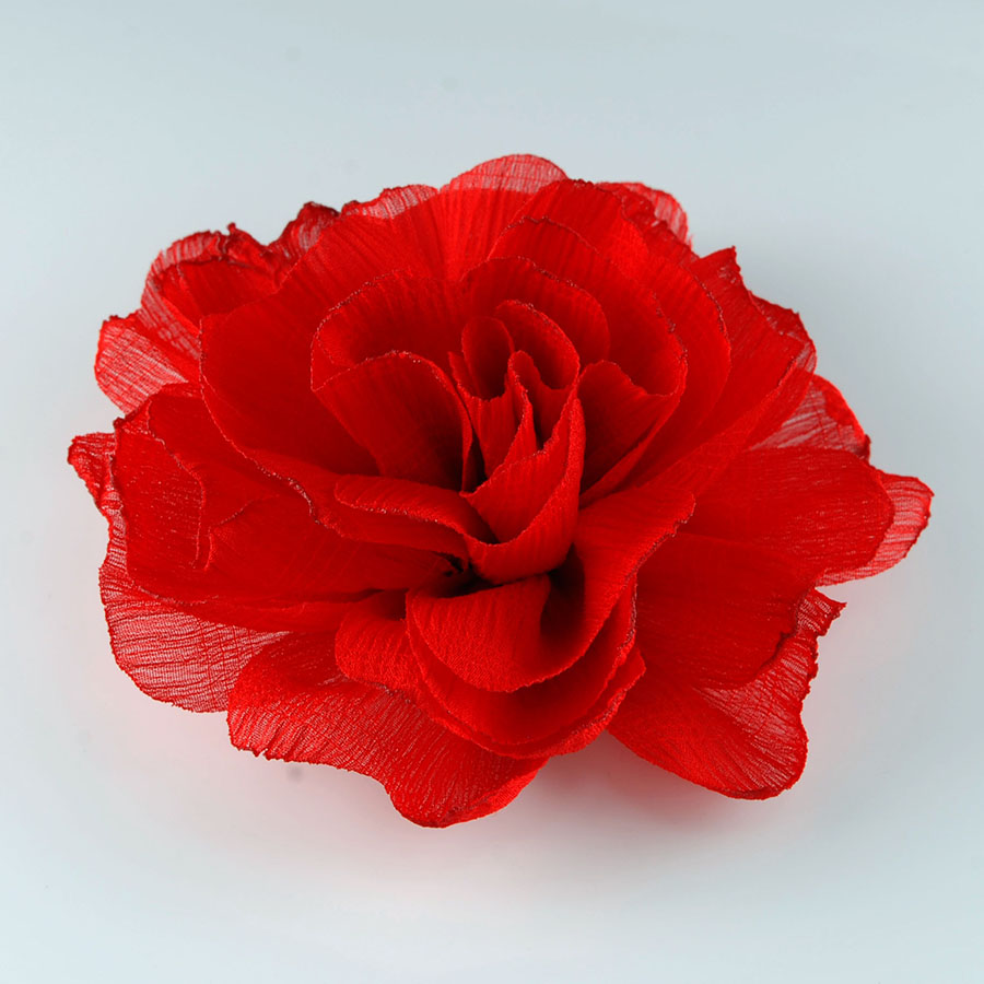Handmade fabric flower made from wrinkle material in red fabric color with safety pin and alligator clip on back.