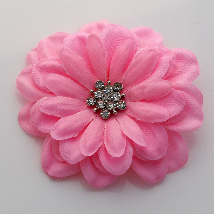 Yellow satin flower pin made come with a sparkling rhinestone button in the flower center. The flower assembled with a safety pin on the back for attaching to the clothes. Flower size measures 3-1/4 inches wide. Fabric Color: White, Rhinestone in clear crystal.