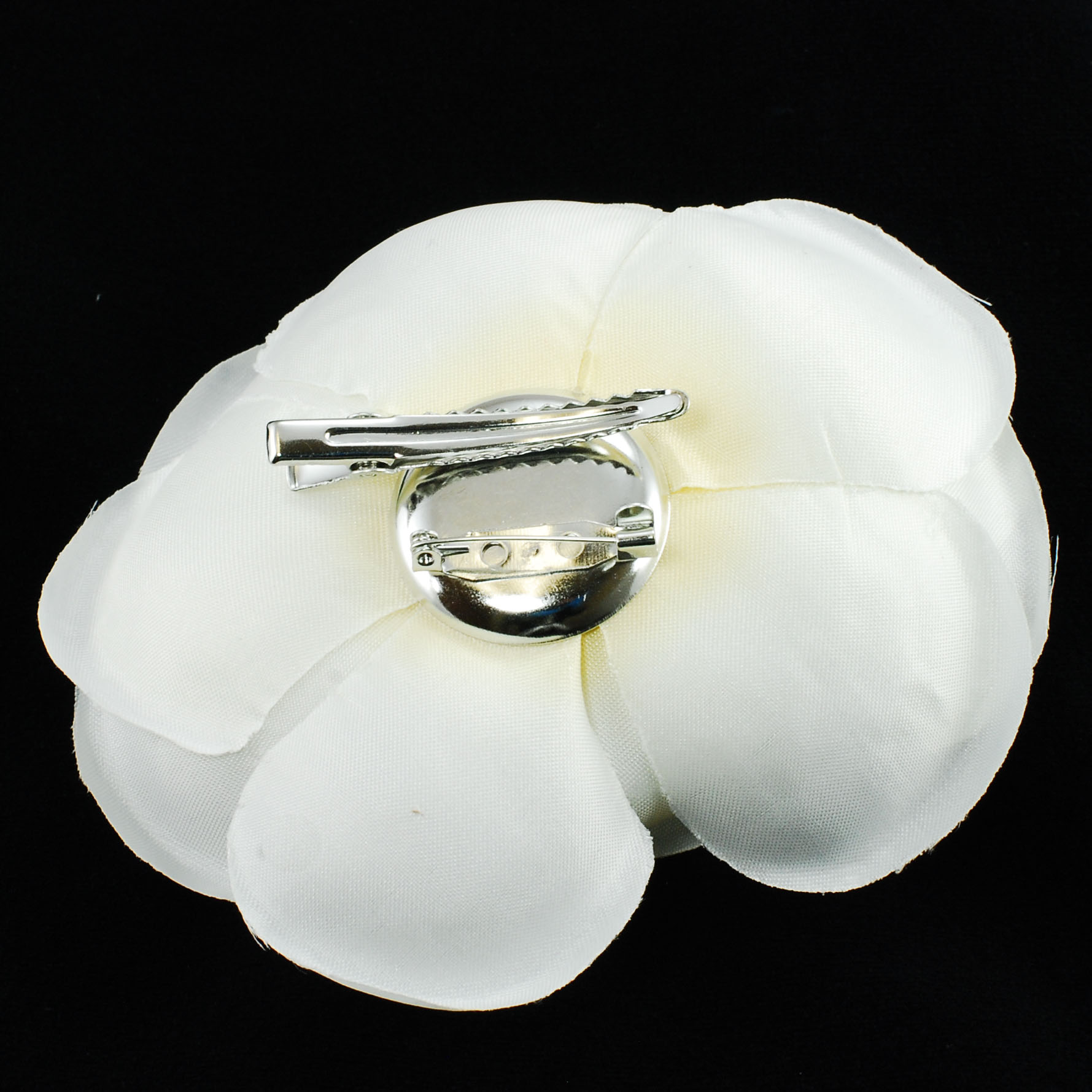 Fabric Flower pin brooch in satin fabric with clear crystal rhinestone in the center; Color: Light cream ; Size: Width : 4-inches; Height: 1-1/4 inches