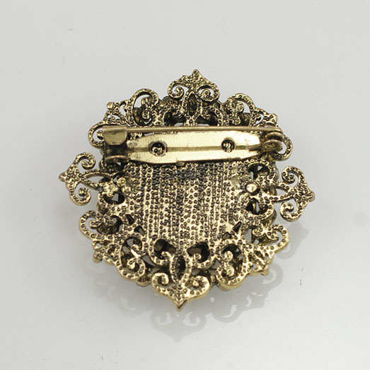 Antique brooch assembled with a chunky clear rhinestone in center, small pearls and crystal rhinestones around the rim. The metal base is plated in antique brass color. Brooch size: (H) 1-3/4" x (W) 1-3/4"