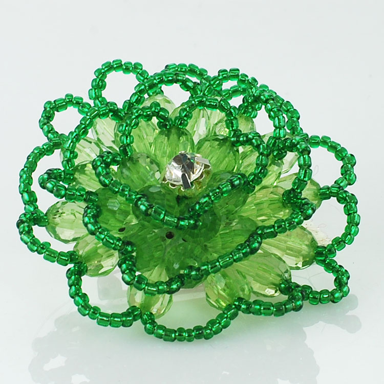 Beaded flower made with small beads with a crystal rhinestone in the center. Color: Green. Size: 2-1/4 inches x height 3/4 inch.