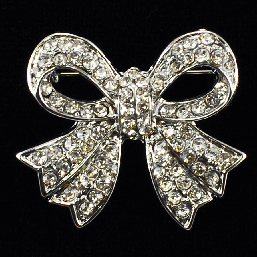 Tiny Rhinestone Bow Brooch Clear crystal rhinestone plated in silver color; Size: Width: 1-3/8 inches x height:1-1/4 inches