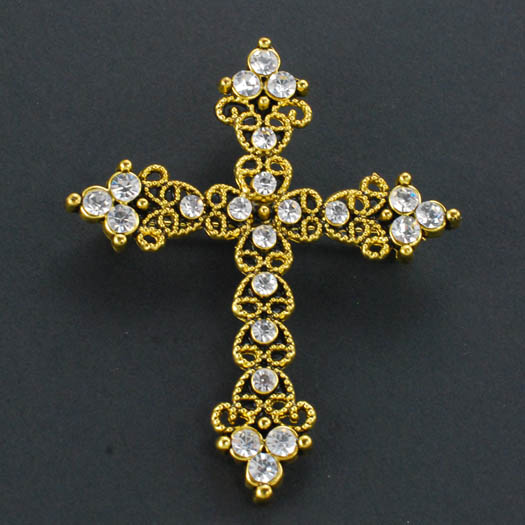 Cross Rhinestone Brooch; Clear rhinestone ; Plating color choices: Antique Silver or Antique Gold Size: Width 2-1/8 inches x height 2-5/8 inches