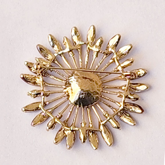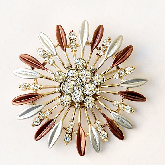 Floral brooch with crystal rhinestones in the center. Petal plated in brown and silver color: Base plated in gold color ; Size: 2 inches in diameter