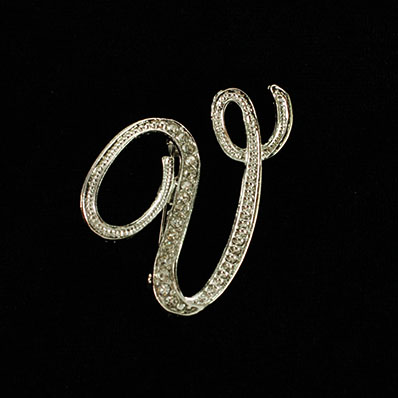 Initial brooch made of sparkling clear rhinestones in silver plating back. 26 initial from A to Z, each initial has a pin assembled on the back, it is best for suit, party decoration, and all events.