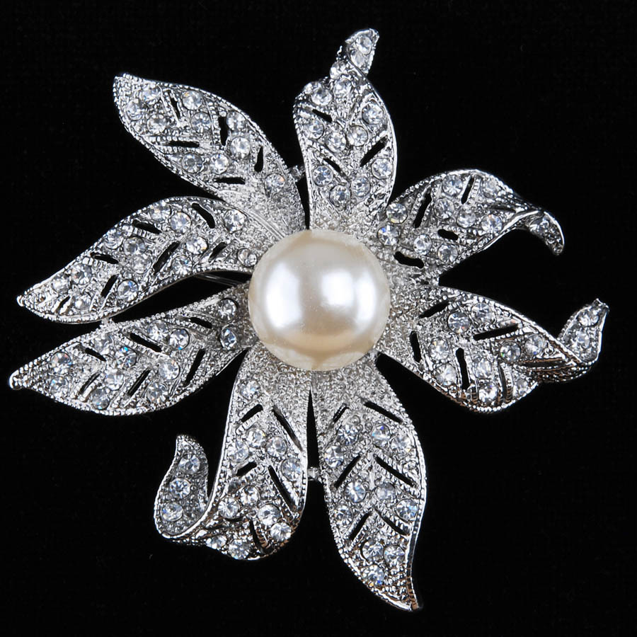 Floral pearl brooch with crystal rhinestone; Pearl in creamy color; Base metal plated in silver; Size: Width: 2-1/4 inches x height : 2-1/4 inches