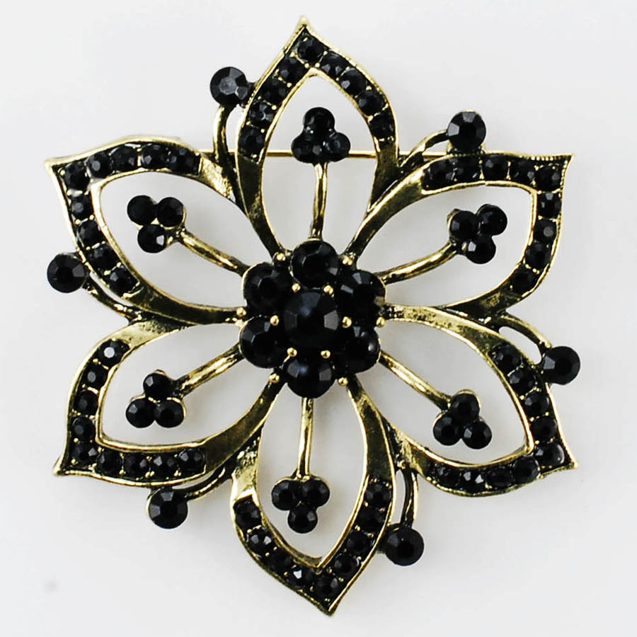 Star shape brooch made with black acrylic stones; Base metal plated in antique copper; Size: 2-1/2 inches
