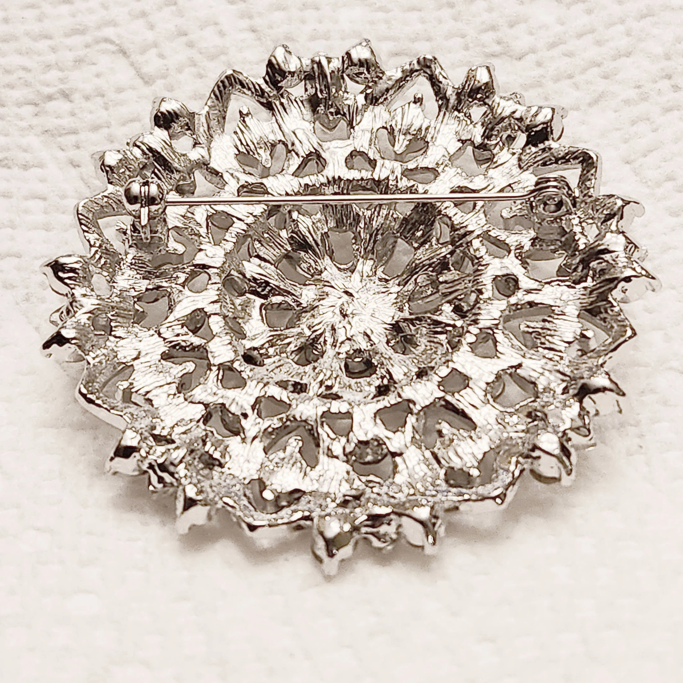 Wedding Brooch Rhinestone bridal brooch; Clear crystal rhinestone and crystal AB Clear rhinestones; Metal plated in Silver color ; Size in diameter: 2 inches