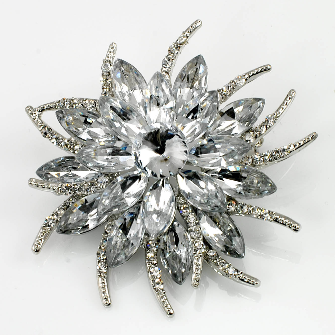 Women Brooch made of high quality acrylic oval rhinestone with rivoli rhinestone in the center; base plated in Silver color ; Width: 2-1/2 inches.